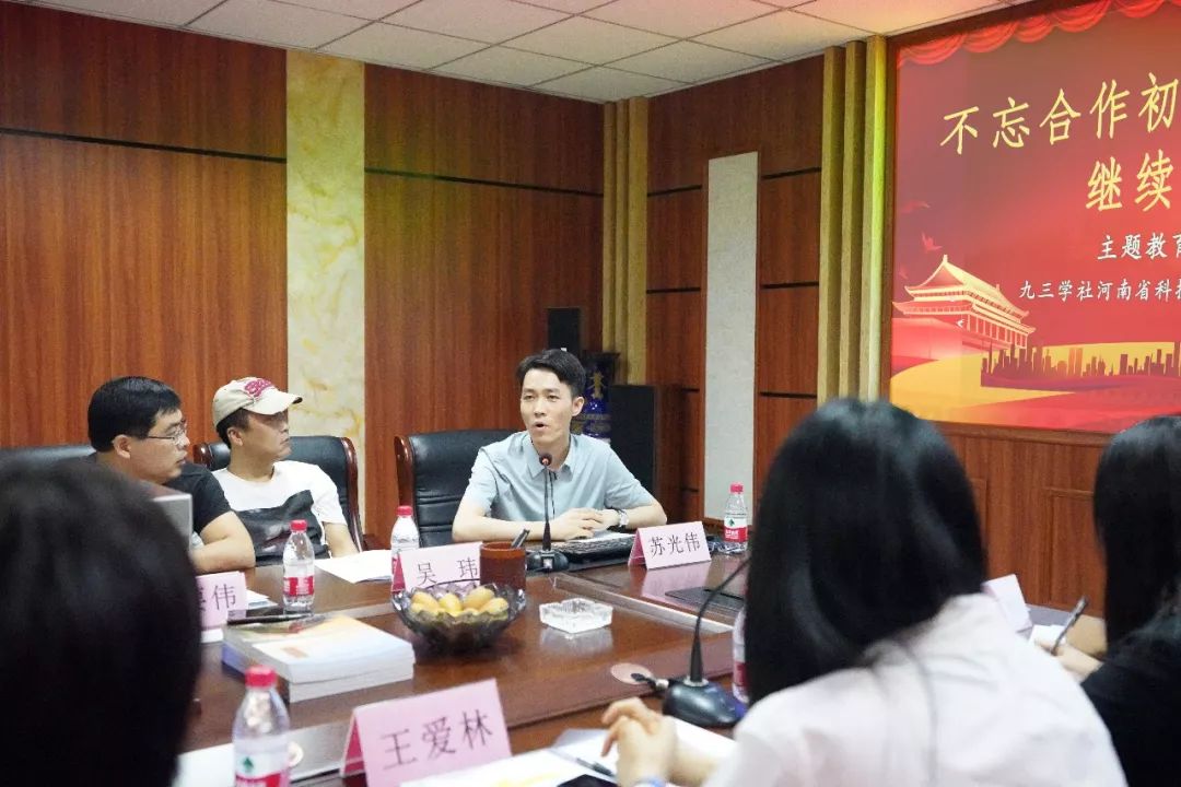 九三学社社员、河南华磊古建集团产品研发师苏光伟在会议中做汇报。苏光伟谈到,要将集团事业的发展与国家的发展紧密融合在一起,将集团的命运和民族的命运紧密融合在一起,为建设社会主义现代化强国,实现中华民族伟大复兴的中国梦做出更多的贡献。